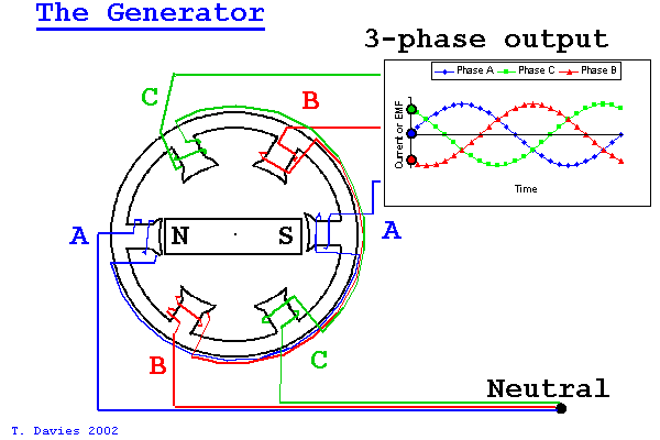 Στο τριφασικό σύστημα εκμεταλλευόμαστε αυτή την εγγενή ιδιότητα του εναλλασσόμενου ρεύματος για να μειώσουμε το αριθμό των αγωγών στο μισό. Αυτό επιτυγχάνεται με την δημιουργία μιας διαφοράς 120 μοιρών στο διάνυσμα τάσεως κάθε φάσης. Για αυτό το λόγο οι γεννήτριες του τριφασικού ρεύματος έχουν 3 πηνία συνδεμένα μεταξύ τους στο ένα άκρο και τοποθετημένα κατά 120 μοίρες γύρω από τον ρότορα.