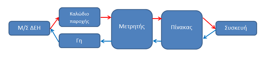 Στο παραπάνω σχήμα φαίνεται συνοπτικά η ηλεκτρική σύνδεση μιας μονοφασικής οικιακής ηλεκτρολογικής εγκατάστασης.