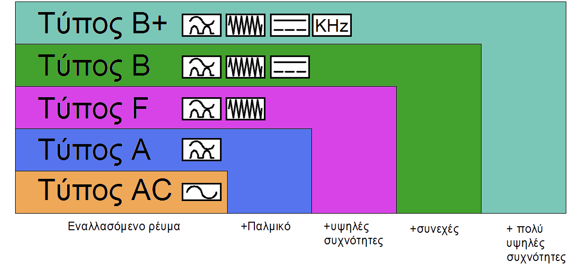 Για τις σύγχρονες οικιακές συσκευές ένα ρελαί τύπου AC είναι συνήθως αρκετό. Εάν έχουμε εγκατάσταση η οποία έχει αρκετά ηλεκτρονικά (υπολογιστές, συσκευές με inverter κλπ.) μπορεί να τοποθετηθεί ένα ρελαί τύπου Α η F.