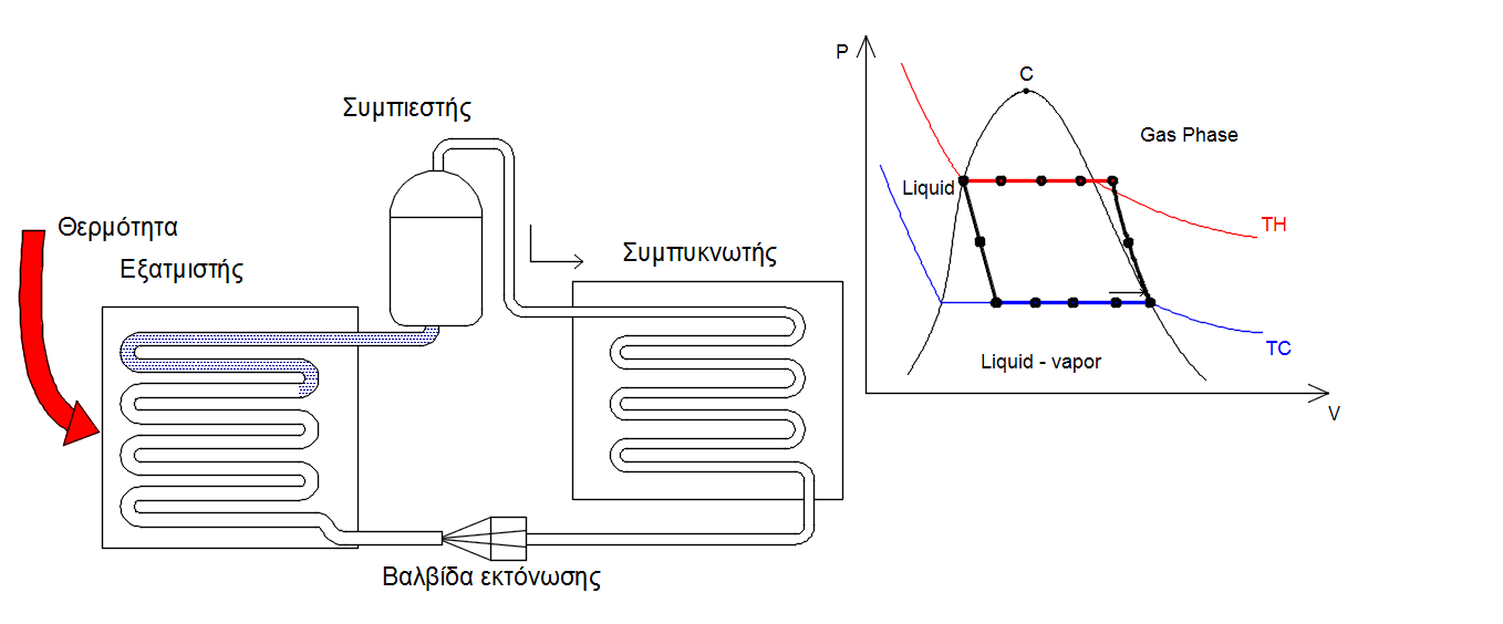 Με τον παραπάνω κύκλο θερμότητα μεταφέρεται από τον χώρο με χαμηλή θερμοκρασία TC στον χώρο με την υψηλή θερμοκρασία ΤΗ.