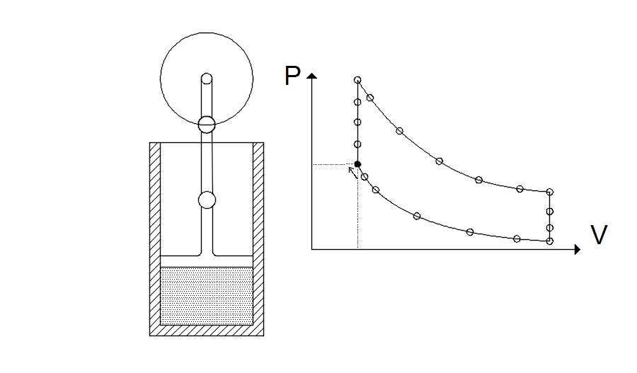 Η διαφορά είναι ότι οι μεταβολές του αερίου σε πίεση θερμοκρασία και όγκο ακολουθούν μία διαφορετική διαδρομή προκειμένου να παραχθεί έργο. Το αέριο ακολουθεί δηλαδή διαφορετικό θερμοδυναμικό κύκλο. Σε ένα διάγραμμα P-V οι καταστατικές μεταβολές του αερίου είναι όπως παρακάτω.